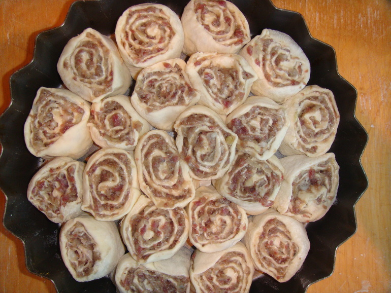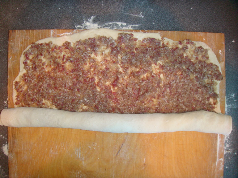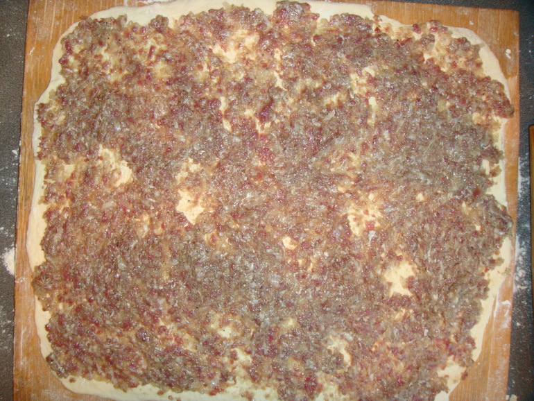 Тесто раскатать слоем в 1 мм. На расстоянии от края разложить кучками фарш: