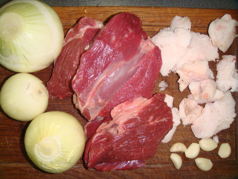 Смолоть фарш из баранины, курдючного сала, лука и чеснока. Посолить и поперчить. Тщательно вымесить: