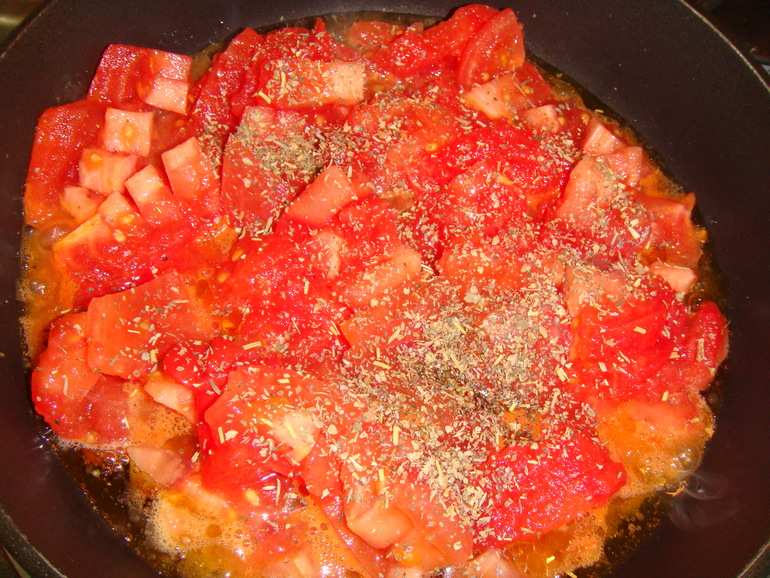 Снять шкурку, мелко порубить. Потушить на оливковом масле с луком и чесноком, с прованскими травами до мягкости: