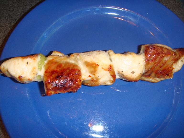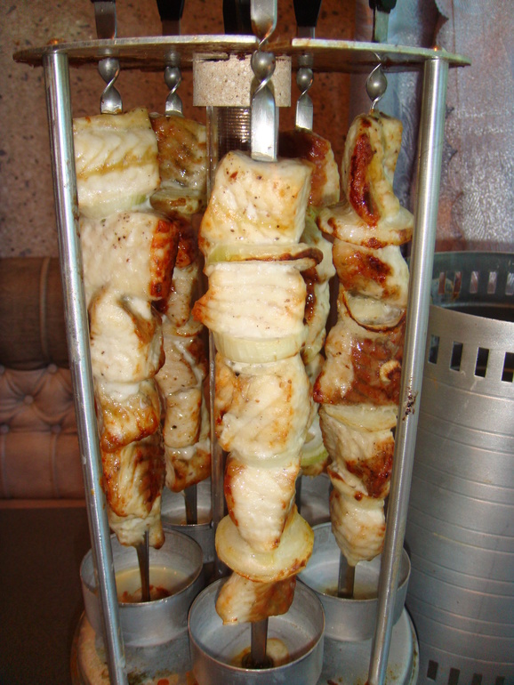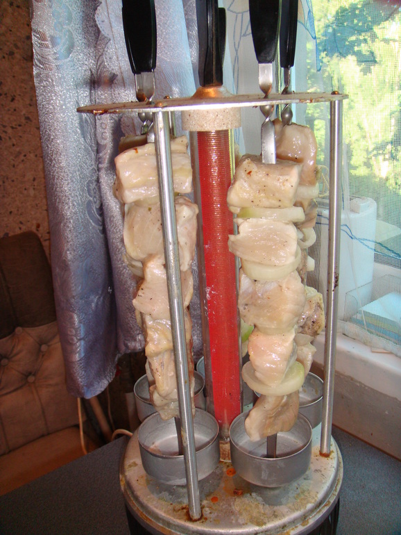 Перемешать, мариновать пару часов. Готовили в этот раз в электрошашлычнице: