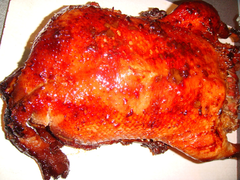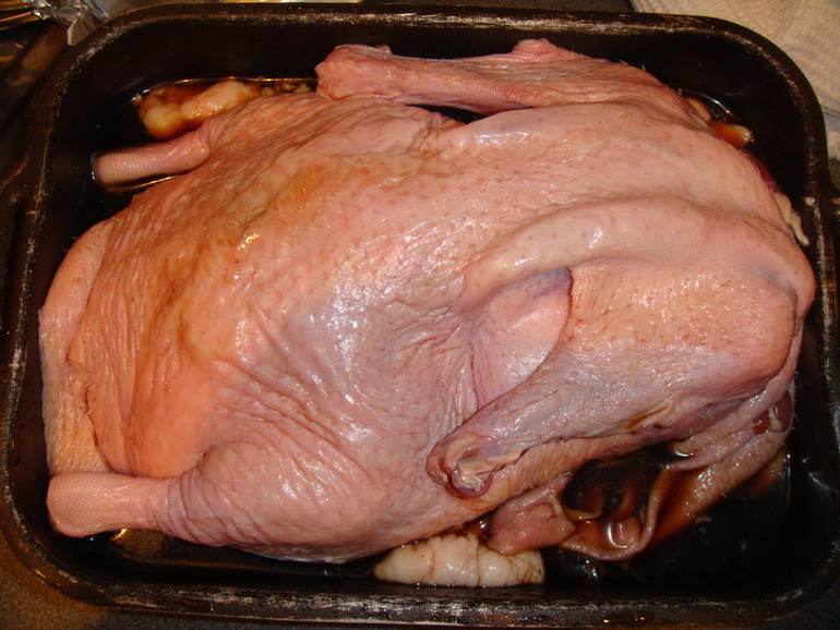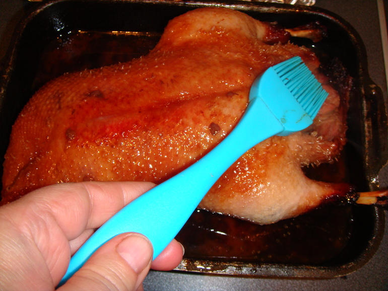 Закрыть фольгой и поставить на ночь в холодильник. Перевернуть утку и еще раз внутри и снаружи натереть соусом: