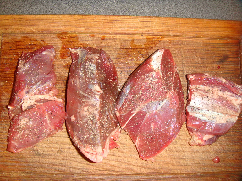 Срезать порционные куски с костей (по 250-300 г на порцию):