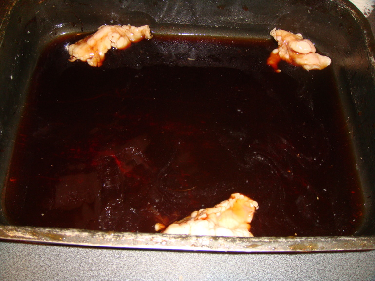 Смешать пол стакана меда, пол стакана соевого соуса и пол стакана коньяка: