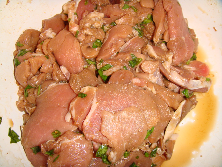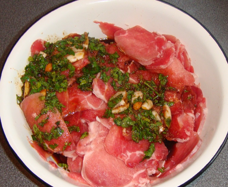 Замариновать мясо в холодильнике минимум на 4 часа (лучше на ночь):