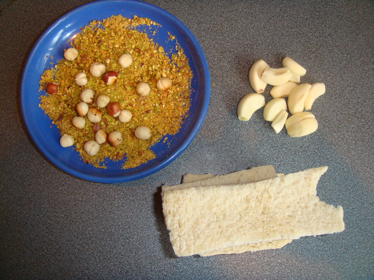 Приготовить 100 г орехов (у меня фисташки и фундук), головку чеснока, 50 г сухарей: