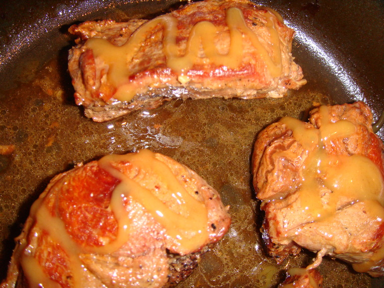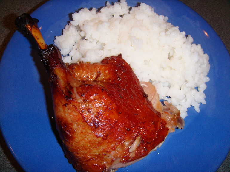 Разделать на порционные куски, подавать с рисом, полив карамелизированным соусом: