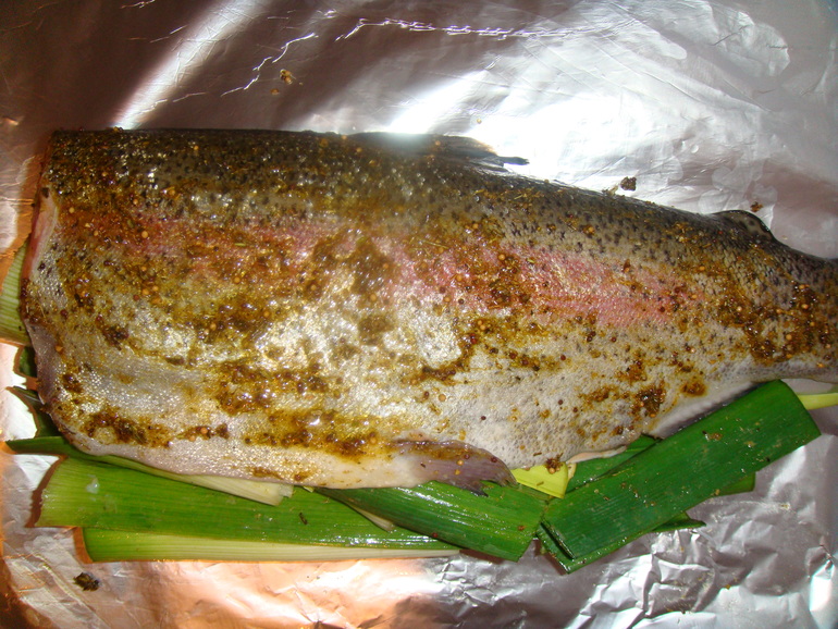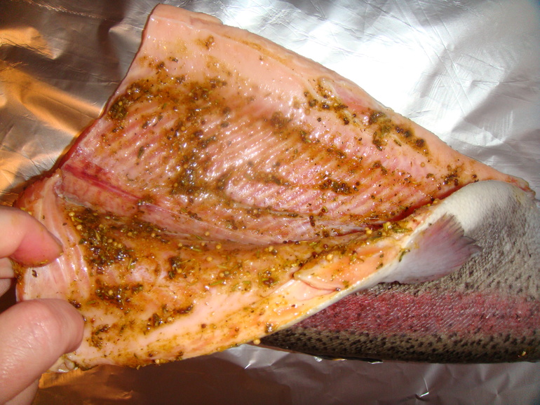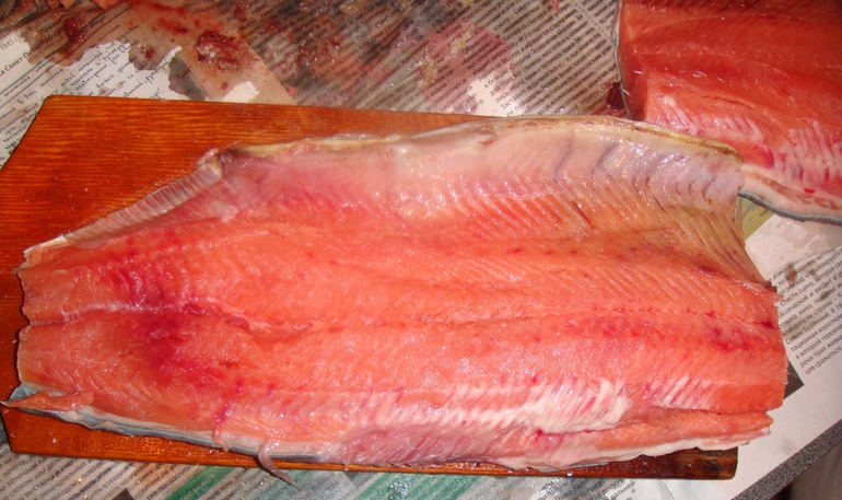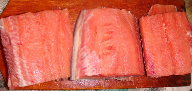 И сразу кусочки красной и белой рыбы (филе форели и судака):