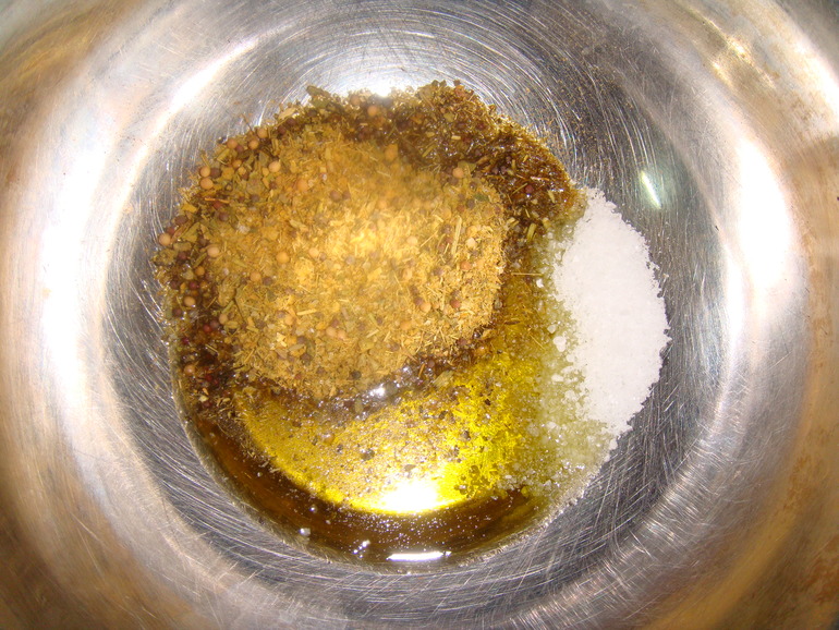 Добавить к 5 ст.л. оливкового масла семена белой горчицы, соль, лимонный перец, любимые травки: