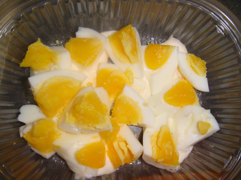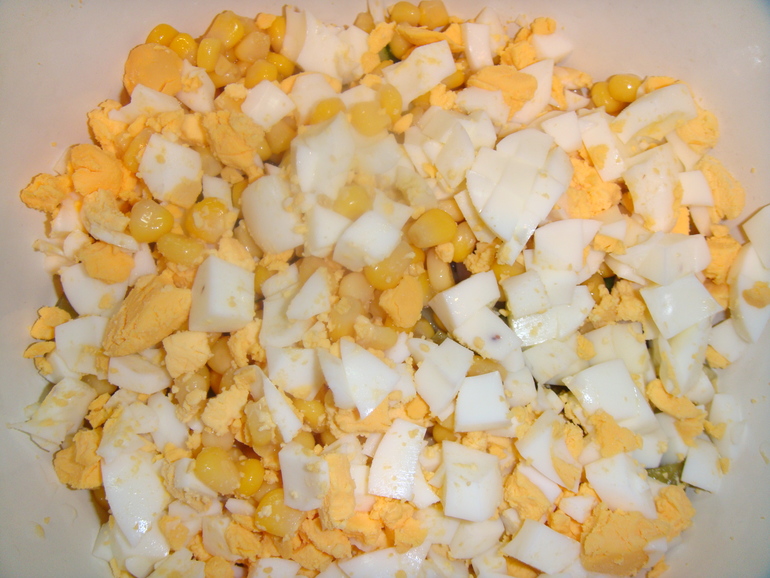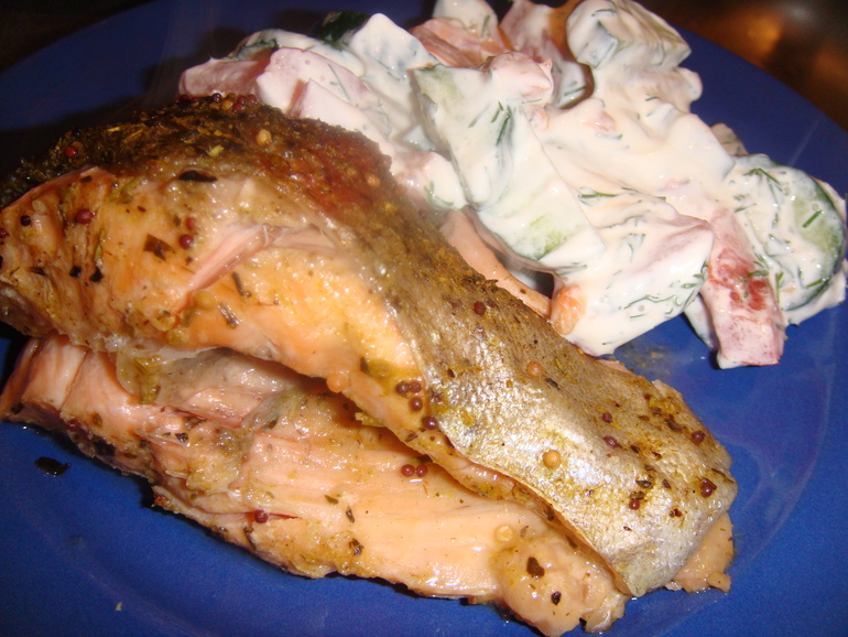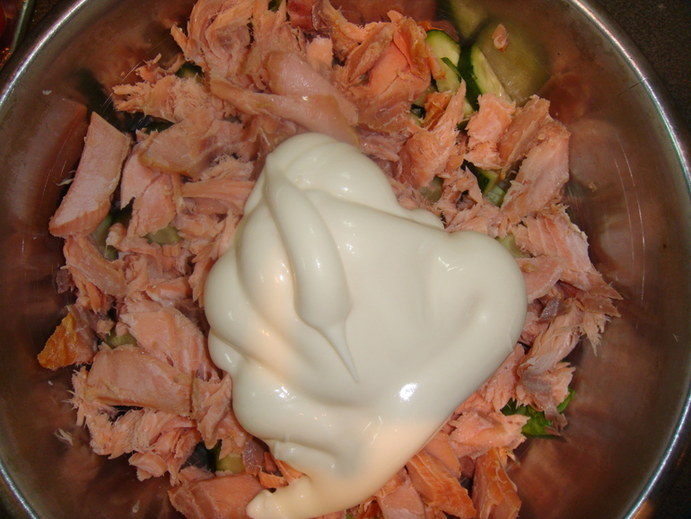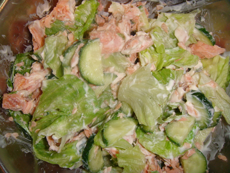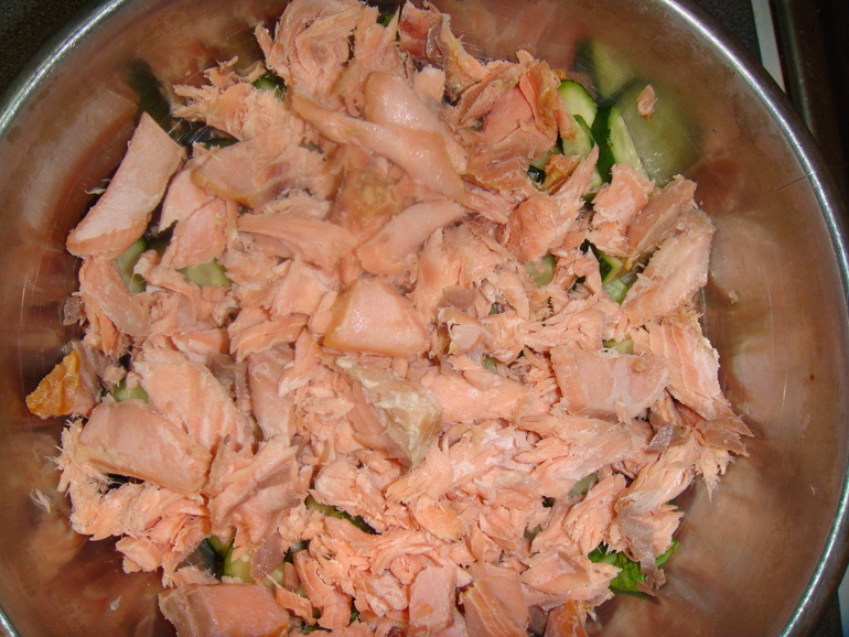 Но рыбу я не выкинула: сняла с костей и использовала в салате а-ля Оливье (только вместо мяса - рыба).