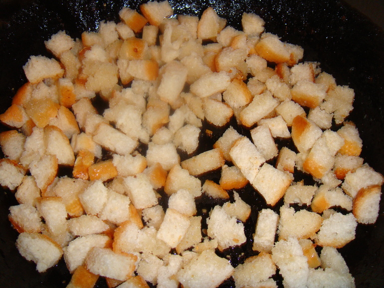 Вытащить чеснок и отправить в масло сухарики. Жарить до образования корочки: