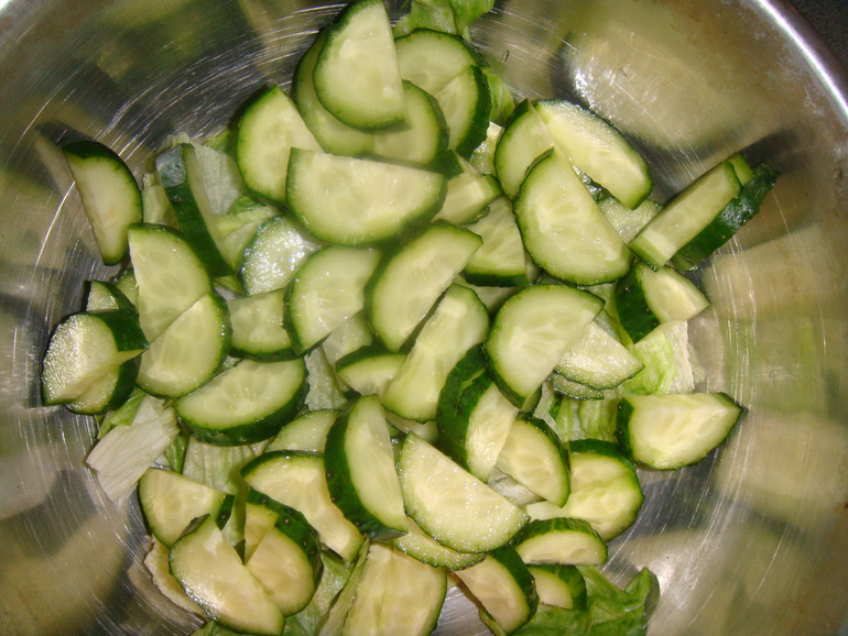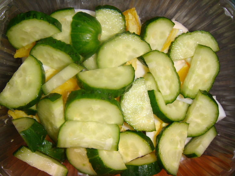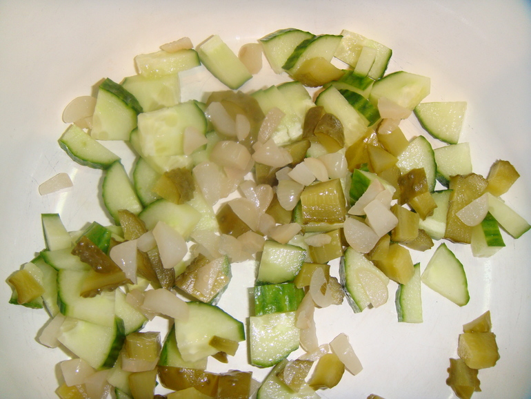 Нарезать свежие и маринованные огурчики, маринованный чеснок: