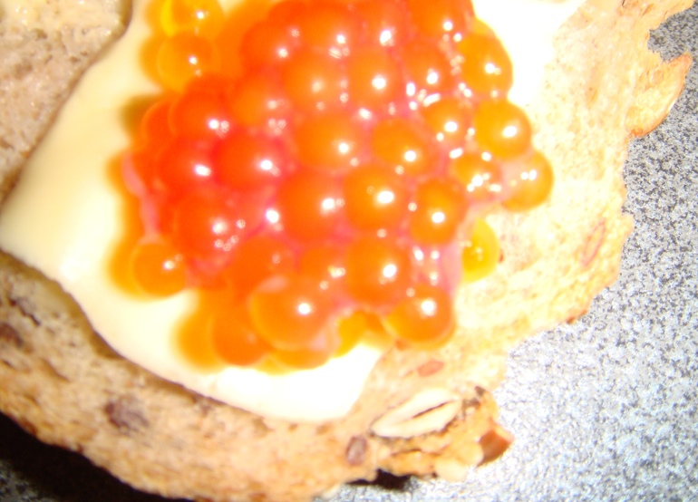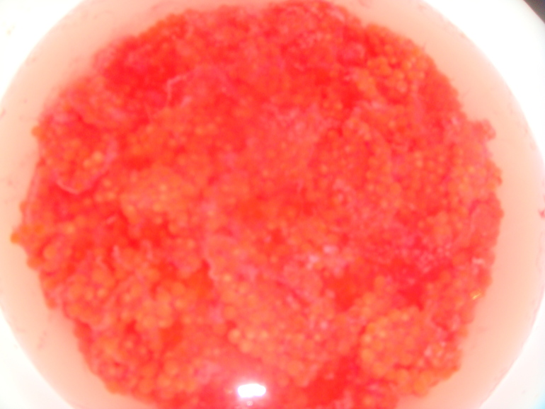 Промыть икру, залить водой 60 градусов на 1 минуту. Слить и промыть в холодной воде: