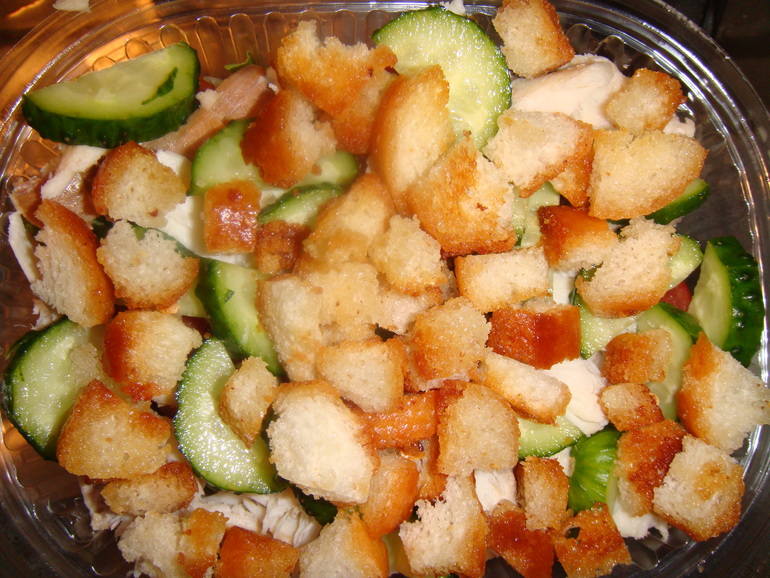 Подсушить в духовке мелко нарезанные сухарики из булки. Поджарить минуту чеснок в оливковом масле: