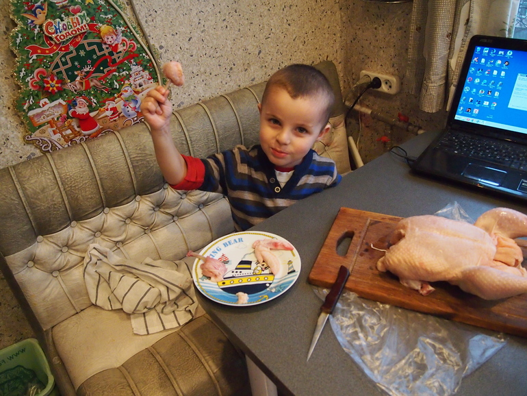 А Вова с папой готовили дома для гостей горячее блюдо - бескостную курицу, фаршированную орехами, зеленью и сыром, сверяясь с видео из Интернета: