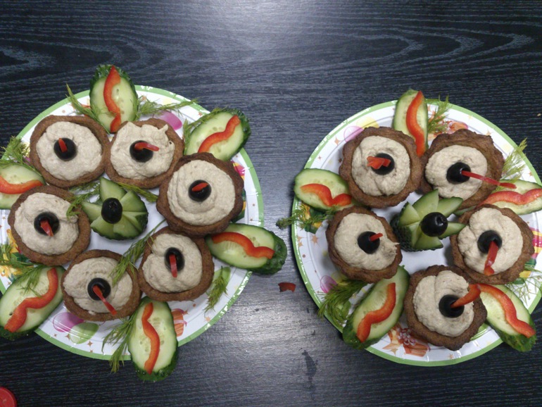 Дальше собирала уже закуску на работе: расставить тарталетки на тарелке, выложить начинку, украсить маслинами, огурцами, зеленью: