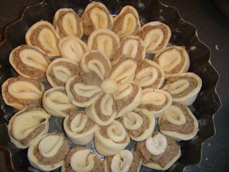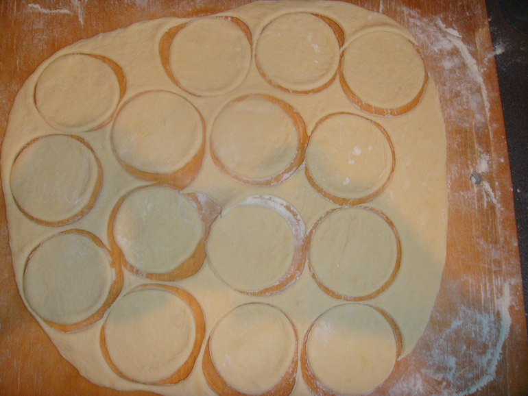 Подошедшее тесто раскатать пластом в 5 мм, вырезать стаканом кружки: