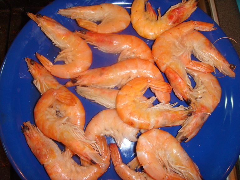 Королевские или тигровые креветки разморозить и очистить от панциря и кишки: