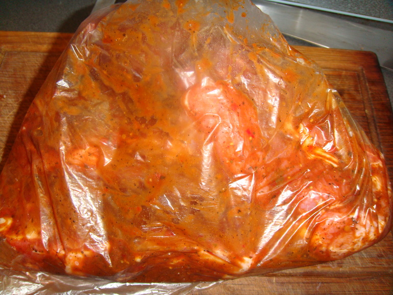 Натираем мясо маринадом и отправляем в пакет на пару часов: