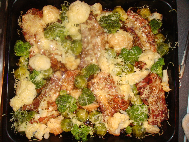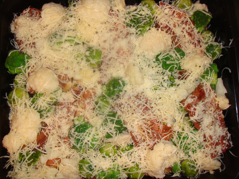 Посыпаем пармезаном (или любым твердым острым сыром):
