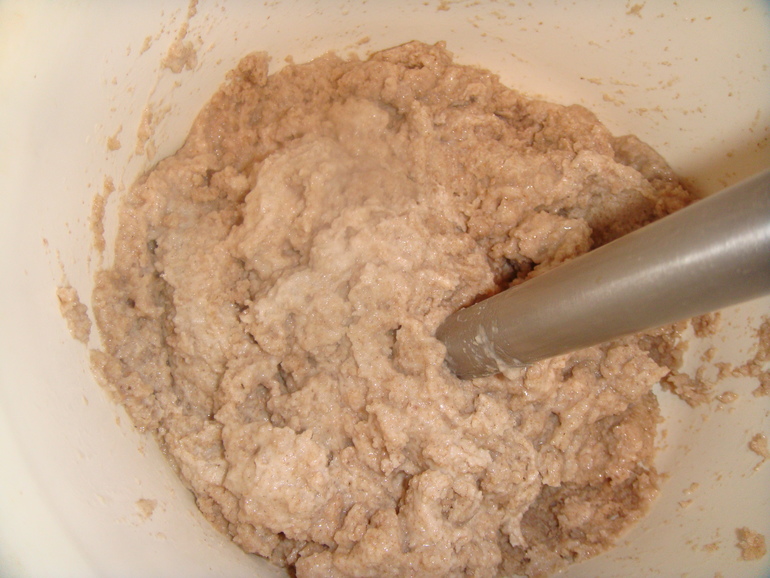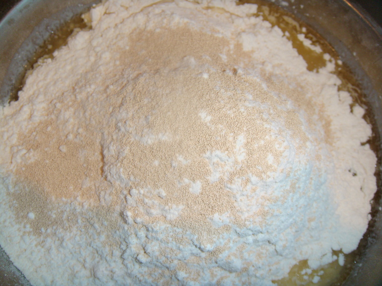 Всыпать 2 стакана просеянной муки и 1 ч.л. сухих дрожжей: