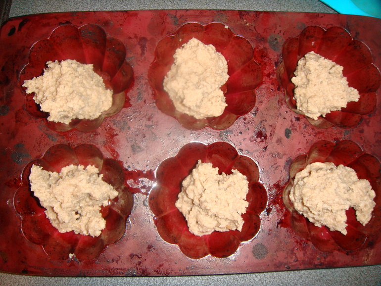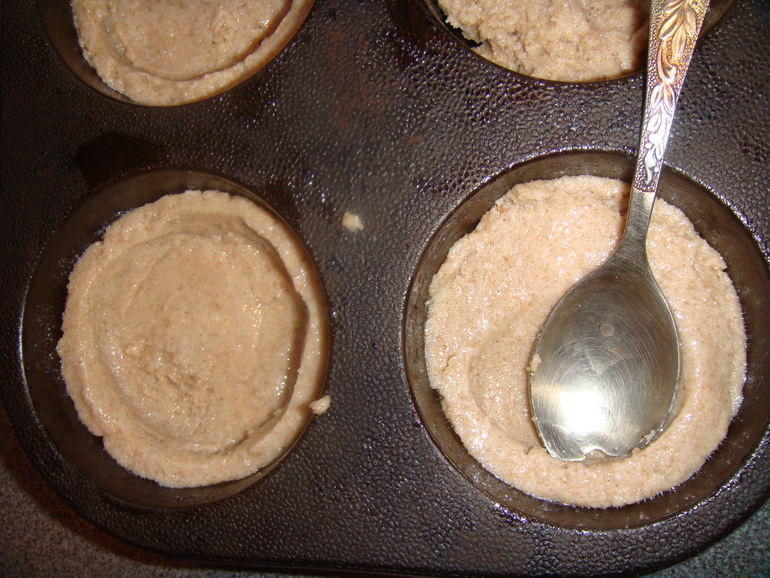 Форму для кексов смазать растительным маслом. Положить в каждую по 1 ст.л. теста: