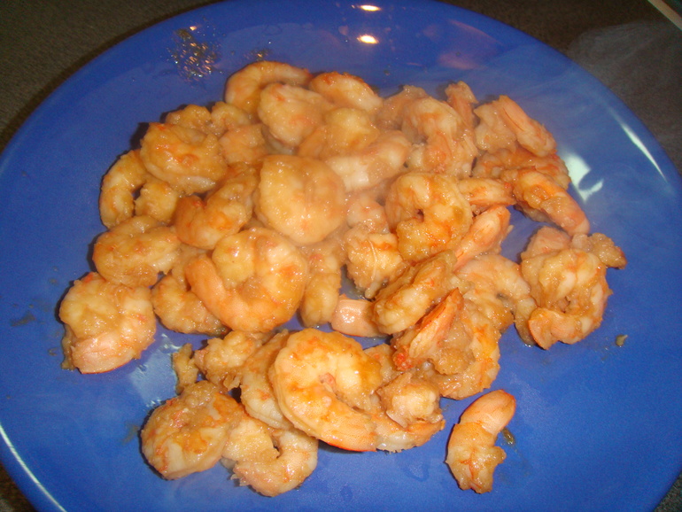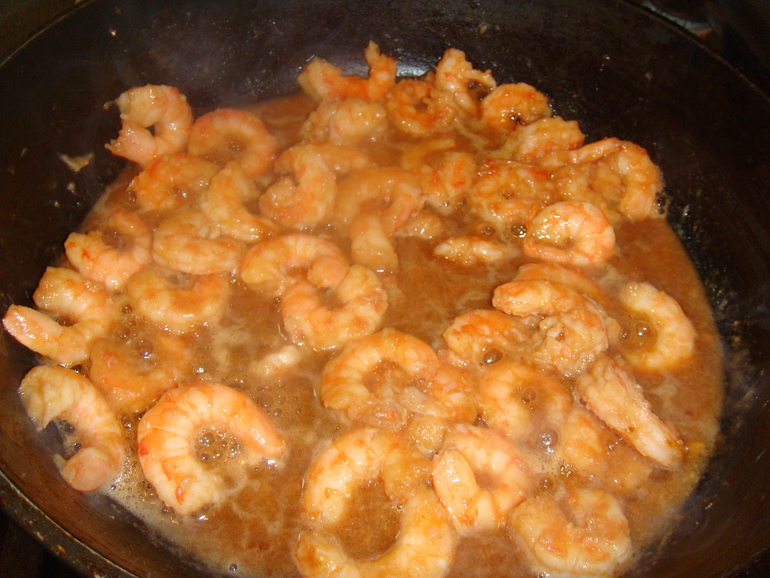 Разогреть на сковороде сливочное масло, добавить соевый соус и "жидкий дым", всыпать креветки:
