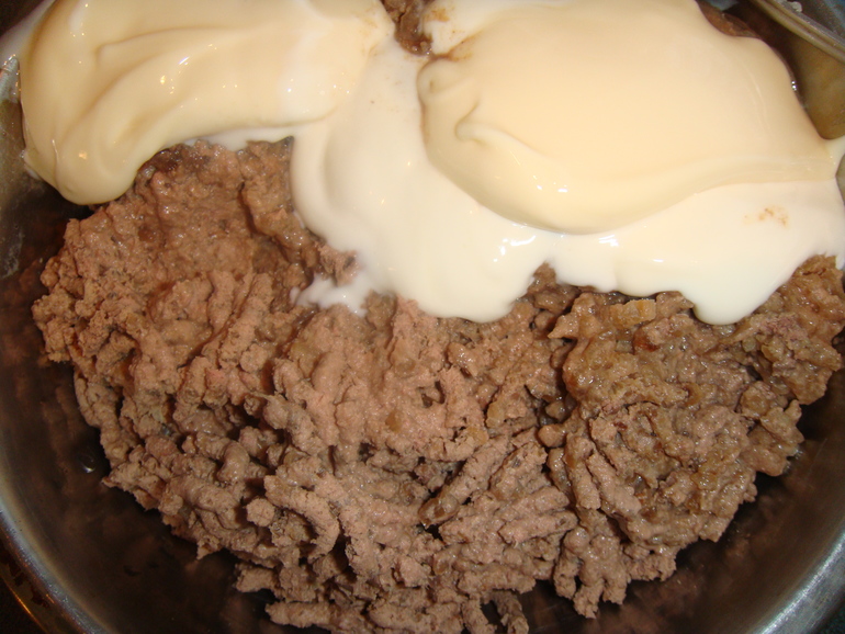 Смолоть остывшую печенку вместе с луком, добавить 200 г плавленного сыра: