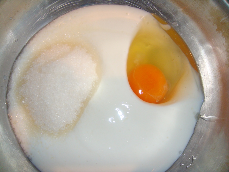 Для теста подогреть 250 мл кефира до 35-40 градусов, добавить 2 ст.л. сахара, 1 яйцо, щепотку соли: