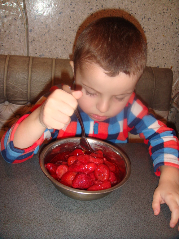 Еще Человечище на этой неделе с удовольствием ел клубнику. Сначала свежую (но ее было мало), а потом и размороженную: