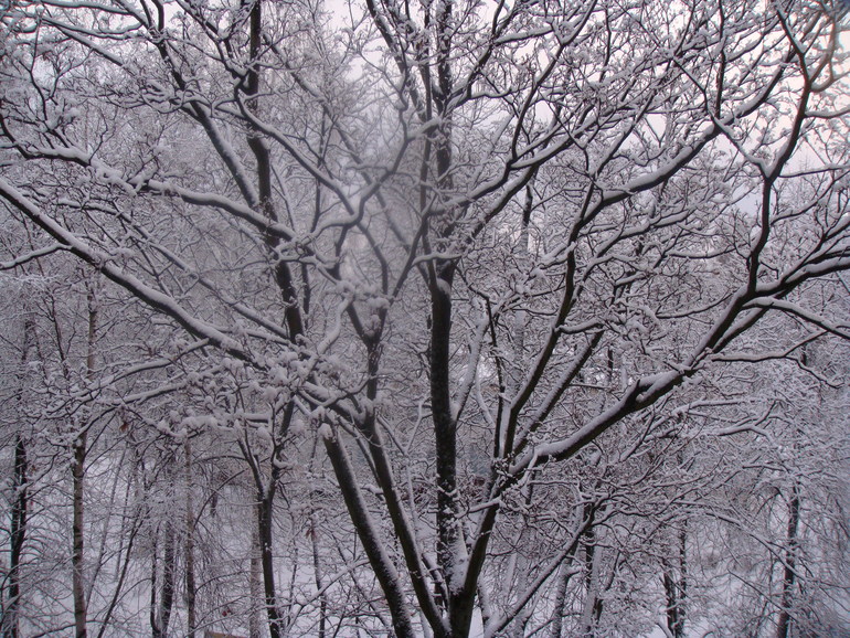 На улице вдруг случилась зима. Не в смысле температуры (-1 всего), зато 2 дня снегопада и вот такая красотень за окном: