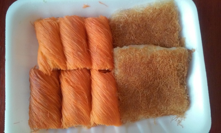 Ребята привезли несколько пакетов фруктов и сладостей. Мне вот такие оранжевые нитки понравились (тесто кутаифи, вероятно):