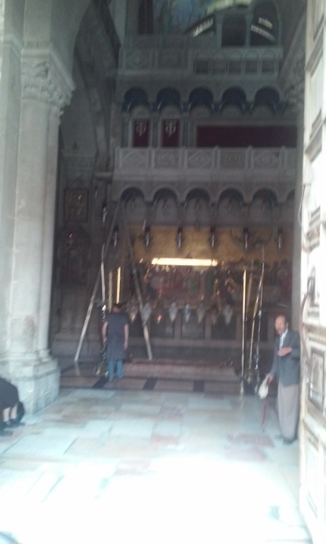 Потом зашли еще с обратной стороны, где виден кусочек старой пещеры. Там подала записки за здравие и купила свечи. Поставила их за здаравие у Кувуклии и еще попросила: