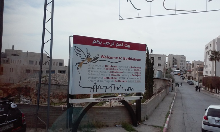 Палестинская автономия отгорожена высочайшей бетонной стеной и пограничным пунктом. Но паспорта не проверяли, просто проехали. Сразу за границей - Вифлеем: