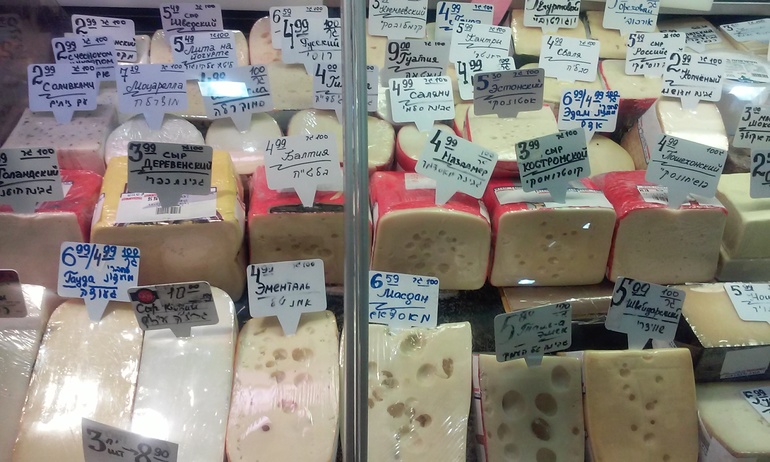Побывали на рынке. Русскоязычных большая половина населения. Никакого напряга ни в магазинах, ни на рынках, ни на улице. Вот, например, витрина сырного отдела: