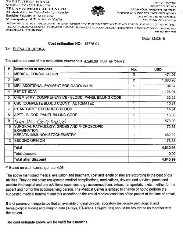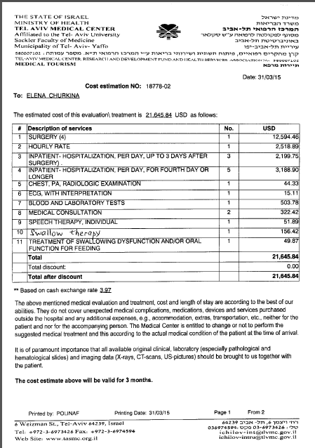 Затраты на лечение в израильской клинике Ихилов (Сураски) -30 514 долларов (1 769 802 рубля).