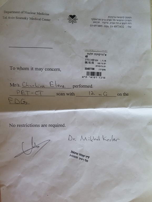 Я была третьей. Вызвали быстро. Куратора со мной не было. Но врач свободно говорит по-английски. Поэтому чувствовала себя очень комфортно. Мой врач - чудо! Заговорил, зашутил, проверил на УЗИ расположение непонятной области, устроил меня поудобней в кресле и на "три-два-один" сделал выверенным движением почти нечувствительный прокол. Сам сделал мазок, сам рассмотрел в микроскоп и сказал, что 99% за то, что все нормально. Но и 1 процент требует наблюдения и "штампа от патологии". Надо через 3 месяца сделать еще одну проверку щитовидки (УЗИ точно, а при необходимости и биопсию) и УЗИ отреагировавшей точки на шее под левым ухом. Теоретически это можно сделать и в России "если у тебя там есть хороший врач, которому ты доверяешь свою жизнь", и прислать ссылку на запись сделанного УЗИ. А у меня как раз такого врача и нет! И как сказал мой врач: "Мне нужно самому трогать, поворачивать и смотреть", а как другой врач делает УЗИ он не знает. Я думала сутки. Решила сделать в конце ноября УЗИ в России (вероятно, в сети Скандинавия). Или кто-то может мне посоветовать еще хорошие клиники, где дадут лицензионный диск с записью обследования (другие в Израиле не принимаются)? Буду очень благодарна!!! Отправлю врачу это УЗИ. Но запланировала и свой визит к нему в начале января. В России как раз будут новогодние праздники 11 дней и можно успеть обернуться, сделать все проверки и получить результаты.