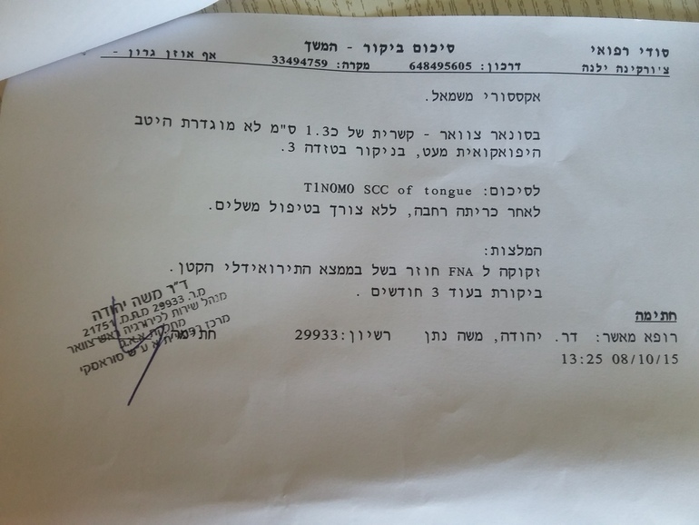 Нет никаких претензий ни к языку, ни к шву на шее. ПЭТ-КТ показало небольшое непонятное затемнение под левым ухом. Поэтому врач сразу в кабинете сделал УЗИ шеи и сказал, что ничего там криминального нету, все в порядке (пока все документы на иврите, потом сделаю заверенный перевод):