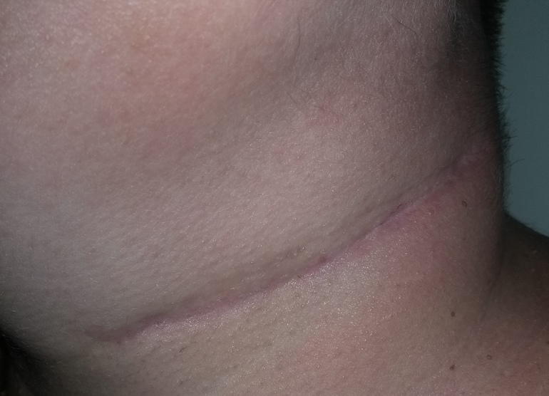 Объективно:язык полностью восстановил свою подвижность (могу хоть вертикально во рту его поставить). Рука запросто поднимается. Ключица прошла и не вспоминаю о ней. Места вырезанных лимфоузлов никак не беспокоят. Шва почти не видно:
