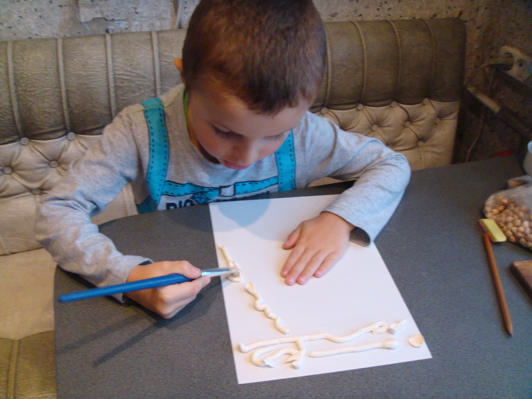 Вова клеем намазал контур дерева: