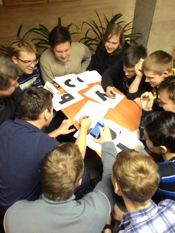 Так что необходима была только добрая воля участников и креатив по разработке заданий (этого у меня в голове хоть отбавляй). Еще потребовались мужские руки, чтобы на игровую площадку в фойе перетащить столы и стулья (тут помогли наши молодые конструкторы и технологи):