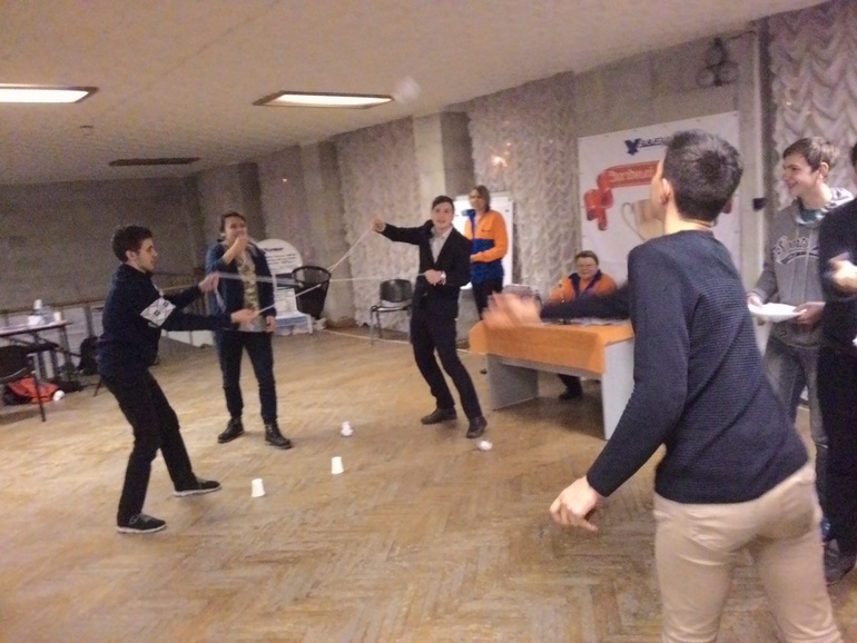 Четвертый конкурс позволил ребятам немного размяться: бросали на меткость скомканные листы бумаги в мусорную корзину, которую команда держала на растянутых веревках: