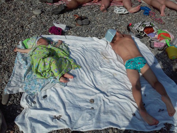 Вода отнимает много сил. Потом могут задрыхнуть вместе прямо на камнях: