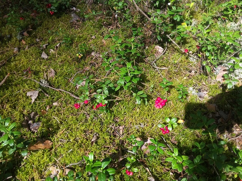 Я как всегда не выдержала и выпрыгнула из машины еще до спуска к озеру. Столько брусники: