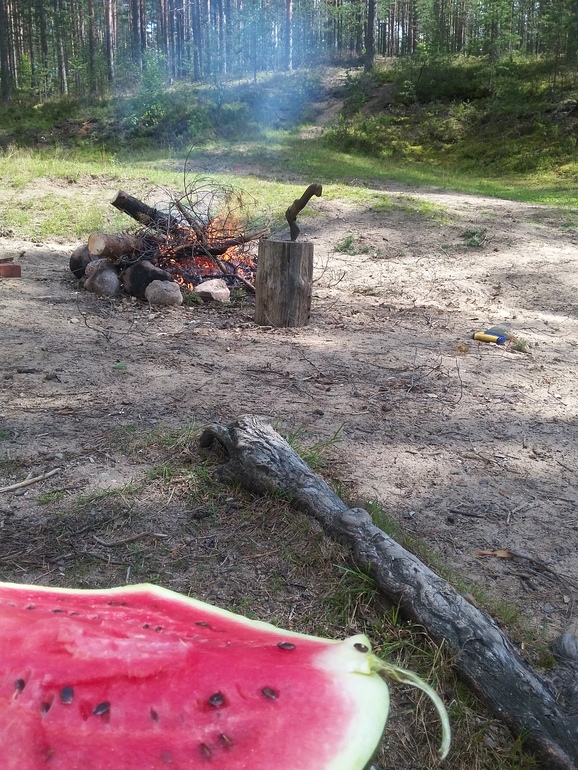 Находились, нагулялись,насобирались. Потом был костер с печеной картошкой, ребрышками, огурчиками и помидорчиками. А пока суть да дело - арбузик: