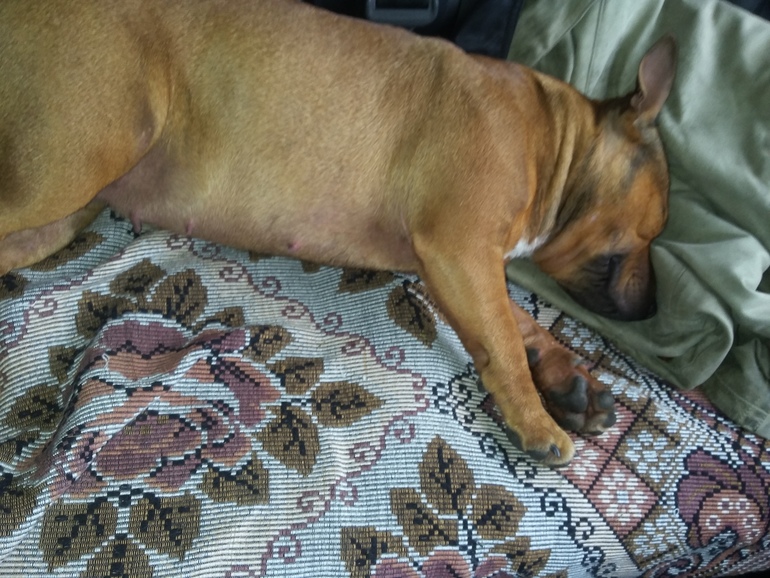 И вовремя - хлынул ливень по дороге домой. Но нам это не мешало. А собаченция просто дрыхла без задних ног, намотавшись по лесу и наплававшись в озере: