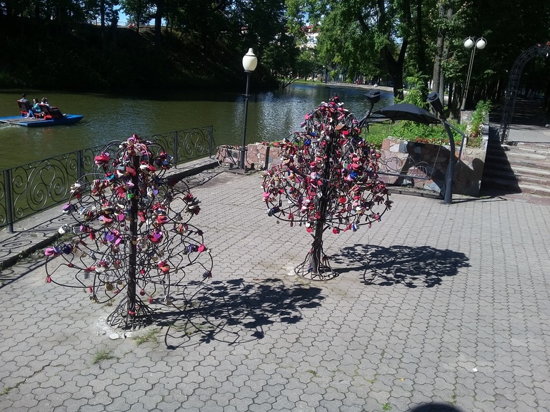Посмотрите на скамейки для влюбленных и деревья с замочками: