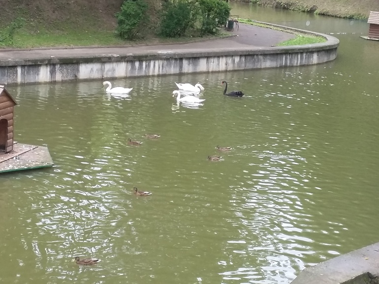 Чего только нет в этом парке! Черные и белые лебеди плавают в рукотворном пруду: