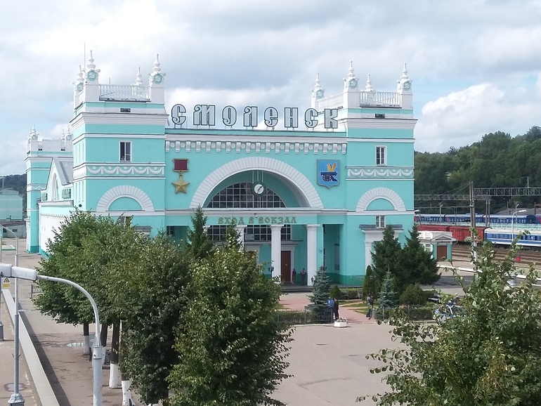 Это герб Смоленска - город на защите рубежей России (пушка) и ценность мира (птица Гамаюн). Встретил нас вокзал ремонтом переезда: