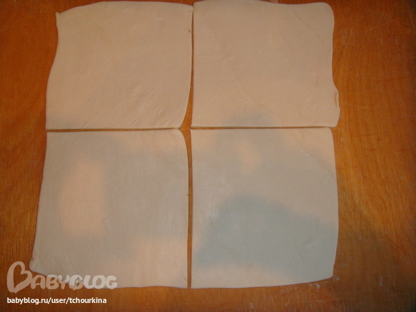 Тесто использую слоеное бездрожжевое в пластинах. Раскатываю, режу на 4 квадрата: