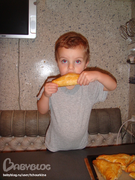 И вот Вовик уже дегустирует пирожок с пылу- с жару: